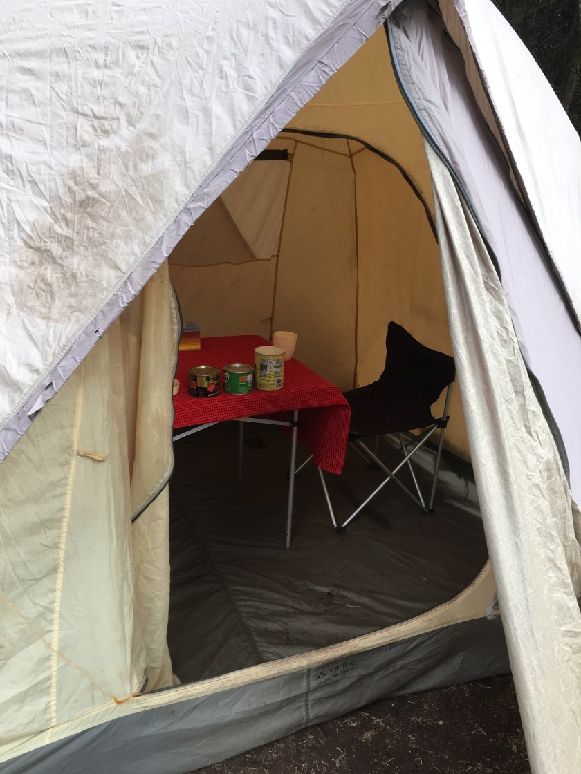 The porters passed us early on and had camp almost set up when we arrived. There’s a small tent for us to sleep in, plus an adorable dining tent with a table for two. They brought us a couple bowls of warm water for washing up, and then we had a snack of tea and popcorn while they prepared dinner.