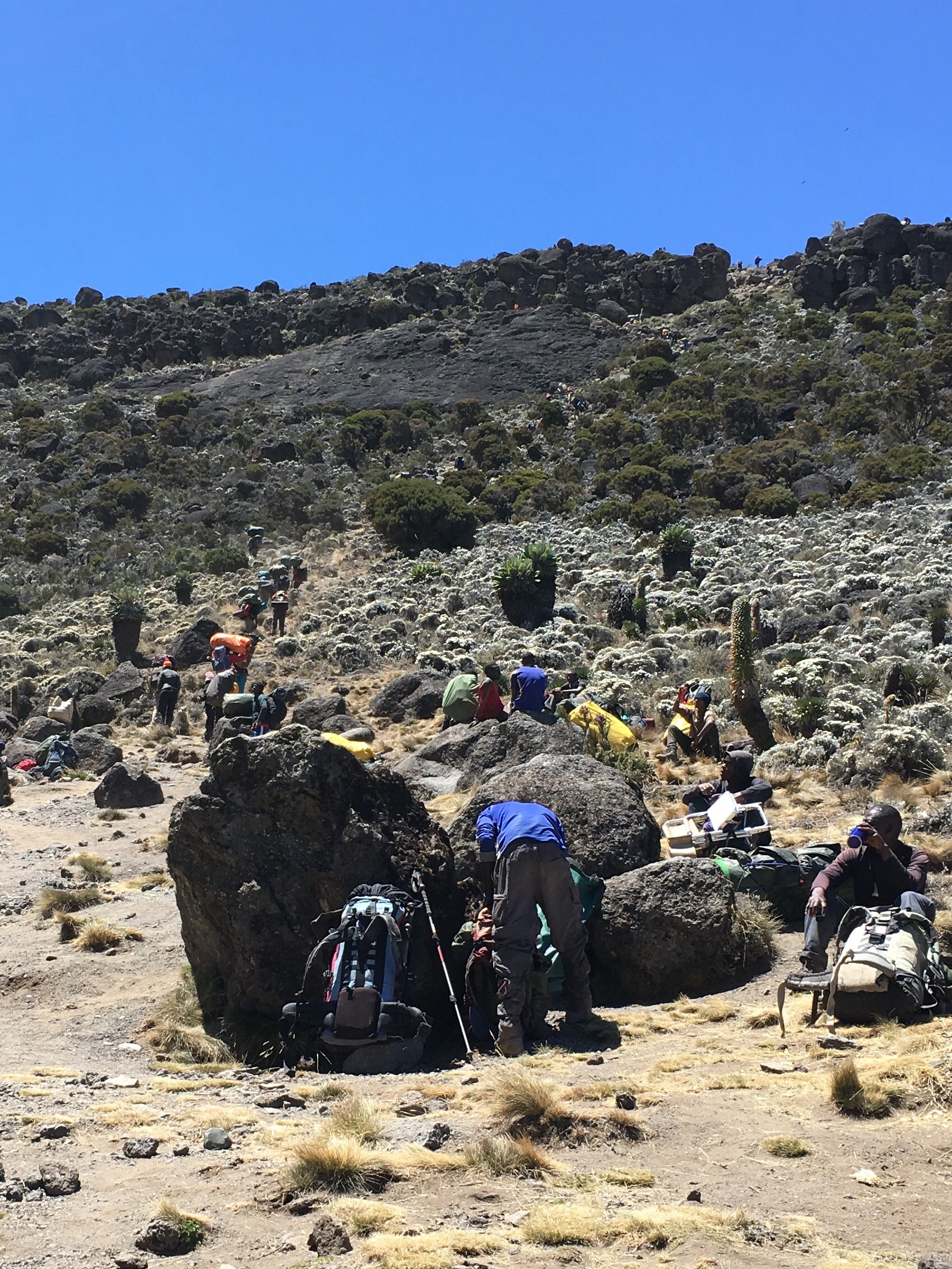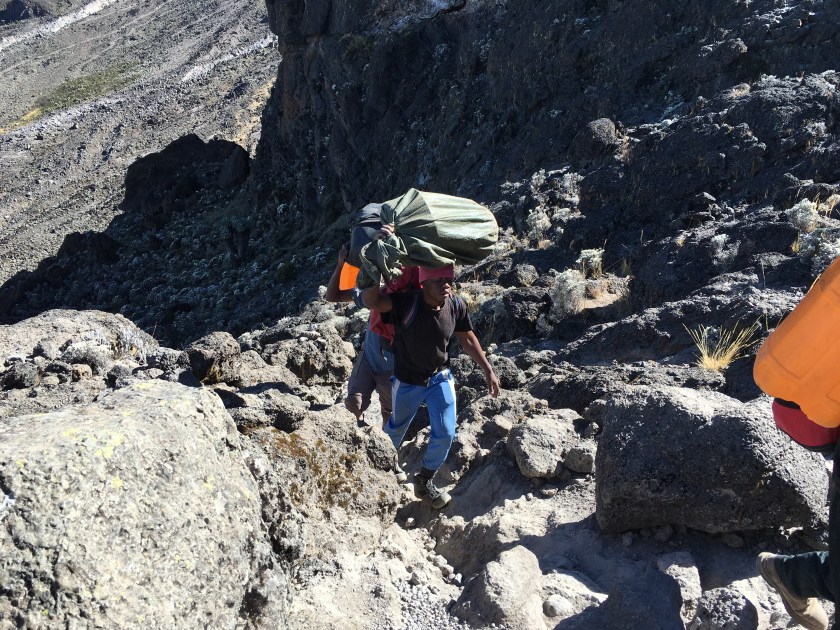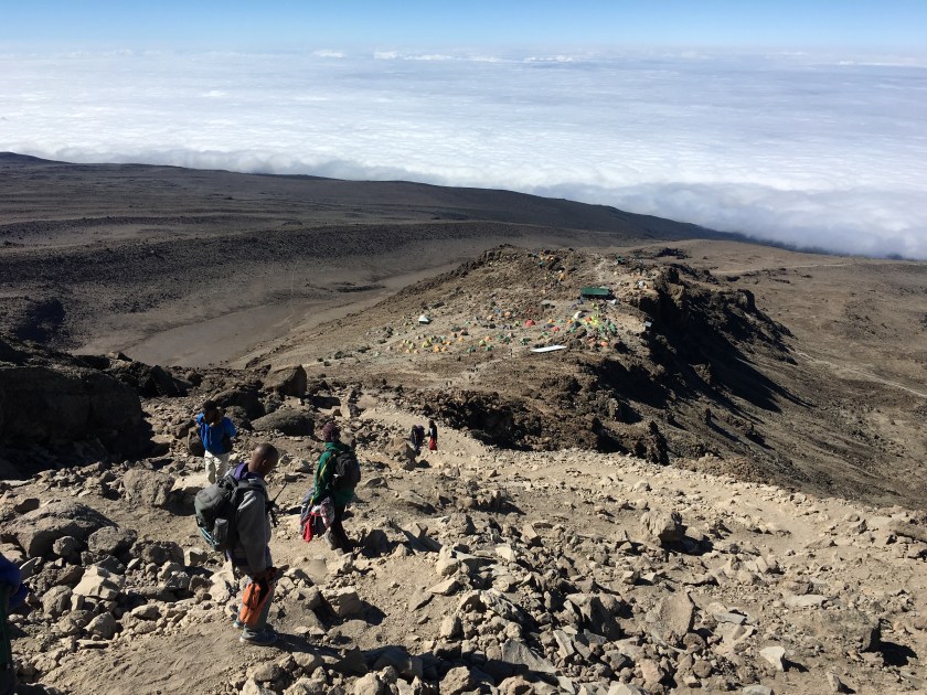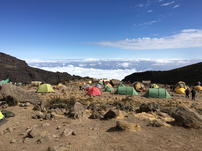 This camp is in a gorgeous spot overlooking the clouds, but it’s crawling with other people. I always pictured this climb as an isolated experience, but tonight seems more like camping at a music festival. (Minus the music, though several other groups like to sing, apparently.) Each climber needs about 3 porters, so it can turn into quite a lot of people at the campsites.